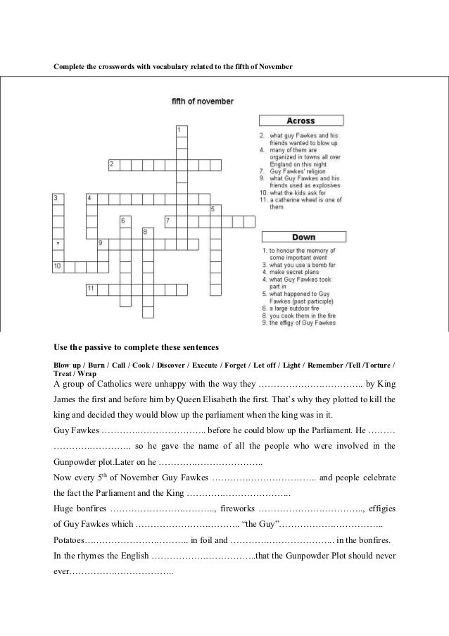 English worksheets Guy Fawkes crossword